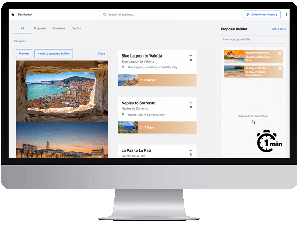 Drag in an itinerary. In fact, drag in a bunch. Check the preview. Copy the link. Send it to the client. Build a new proposal that easily. It will be filled to the brim with gorgeous pictures, interactive maps showing the route, things to do - an impressive proposal in less than a minute.