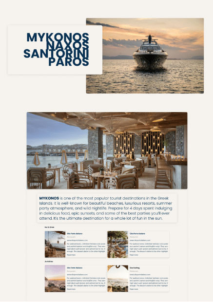 With our comprehensive itinerary library and powerful lightning-fast search you can easily find itineraries (search, for example, "Mykonos"). Whatever you're looking for, we'll find it.